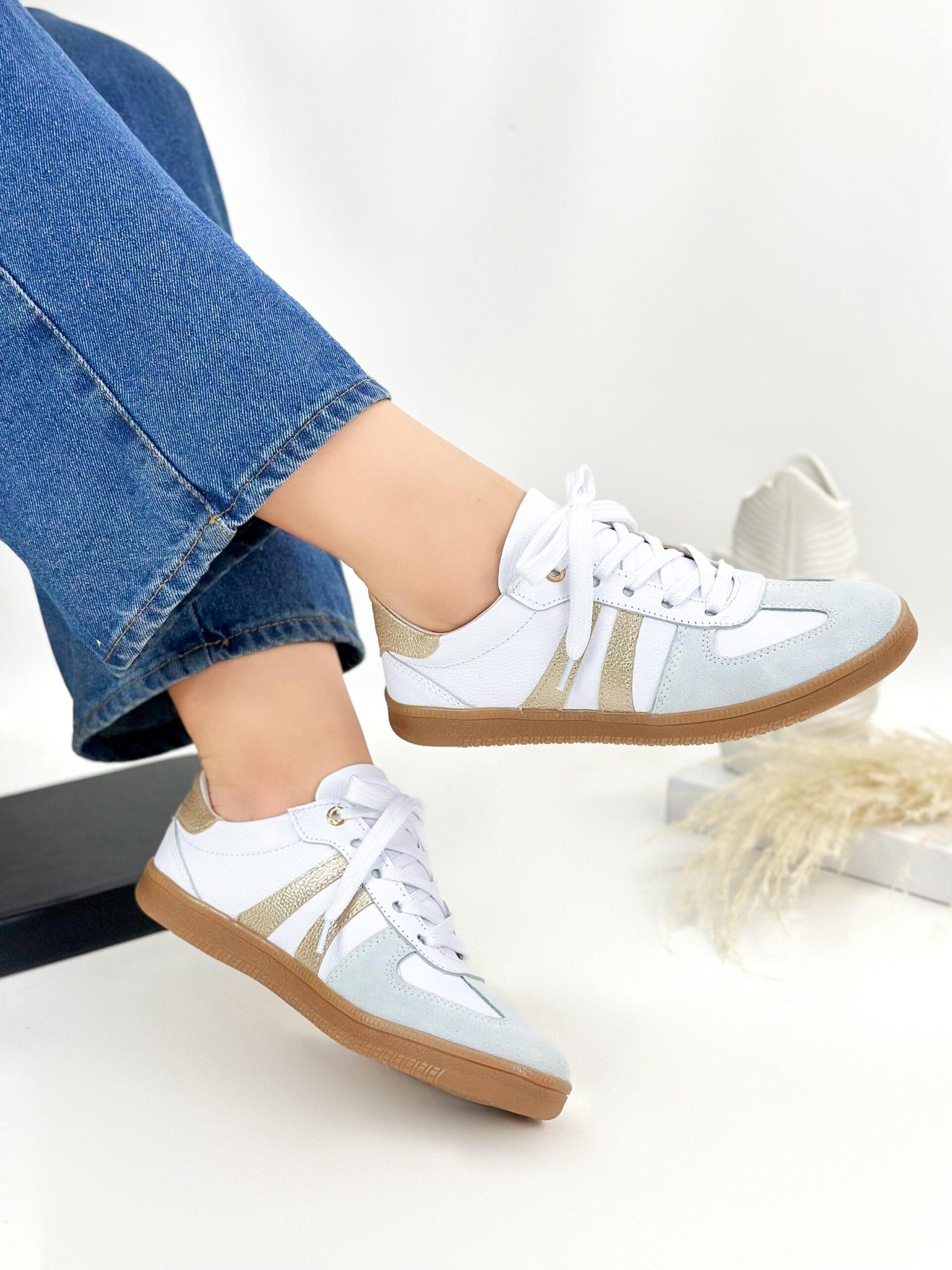 Tenis blancos x champaña en cuero